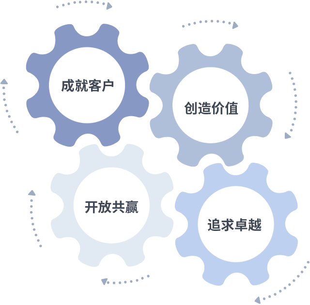 成就客户是一切决策的出发点,,创造价值是衡量所有工作的标准,,,追求卓越是我们做事做人的态度,,,开放共赢是我们的格局也是最终的结果。。。。价值观的齿轮环环相扣,,,,推动着组织里的每个人不断向前。。